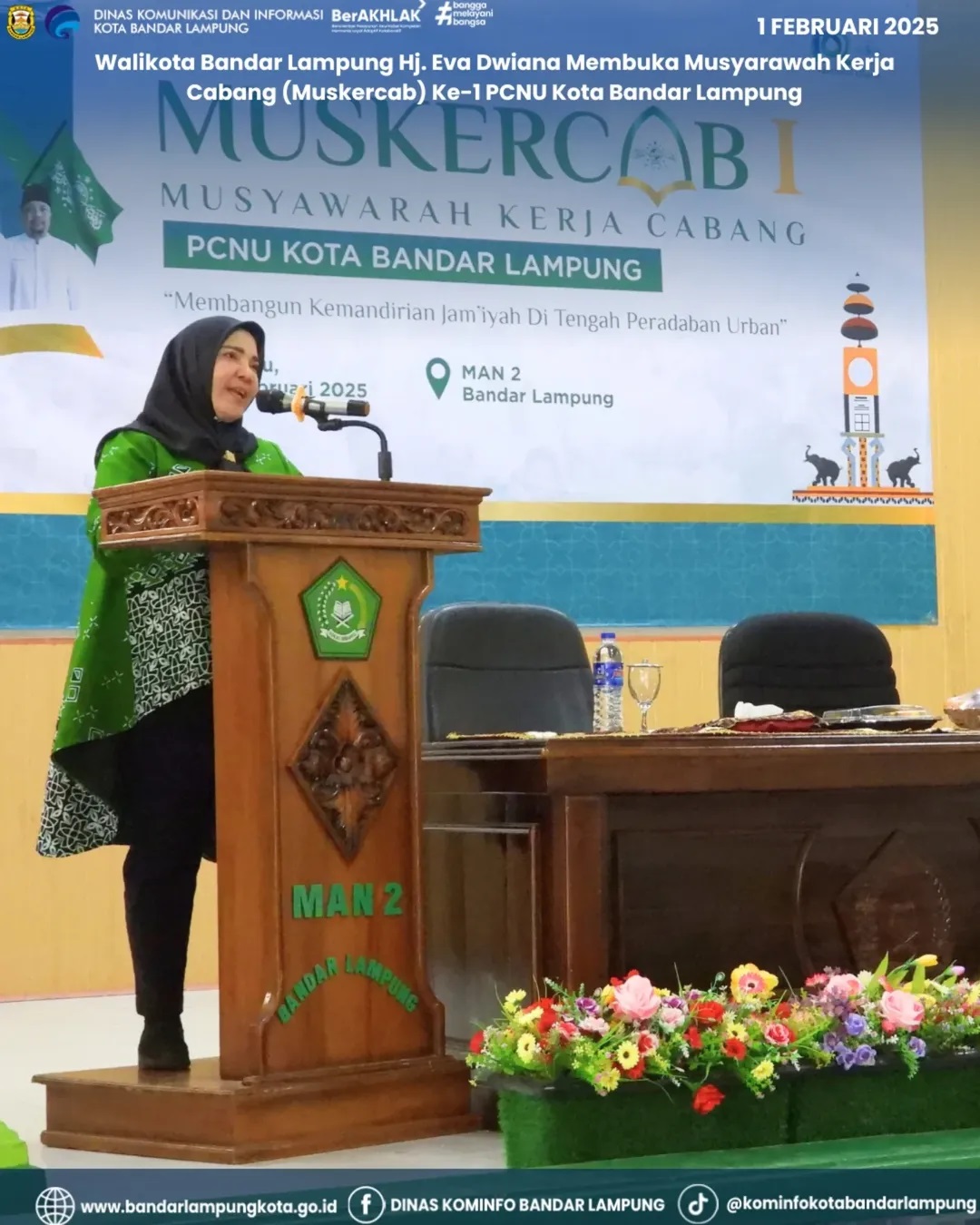 Walikota Bandar Lampung Hj. Eva Dwiana Membuka Musyarawah Kerja Cabang (Muskercab) Ke-1 PCNU Kota Bandar Lampung, di aula MAN 2 Bandar Lampung, Sabtu (1/02/2025).