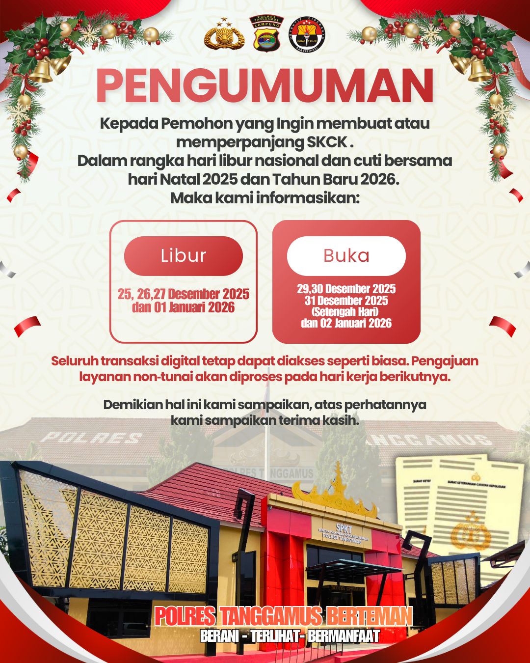 Sementara itu, menurut Kasi Humas Polres Tanggamus Iptu Primadona Laila, S.H., untuk pelayanan Surat Keterangan Catatan Kepolisian (SKCK), Polres Tanggamus menetapkan jadwal libur pada 25, 26, dan 27 Desember 2025, serta 1 Januari 2026.