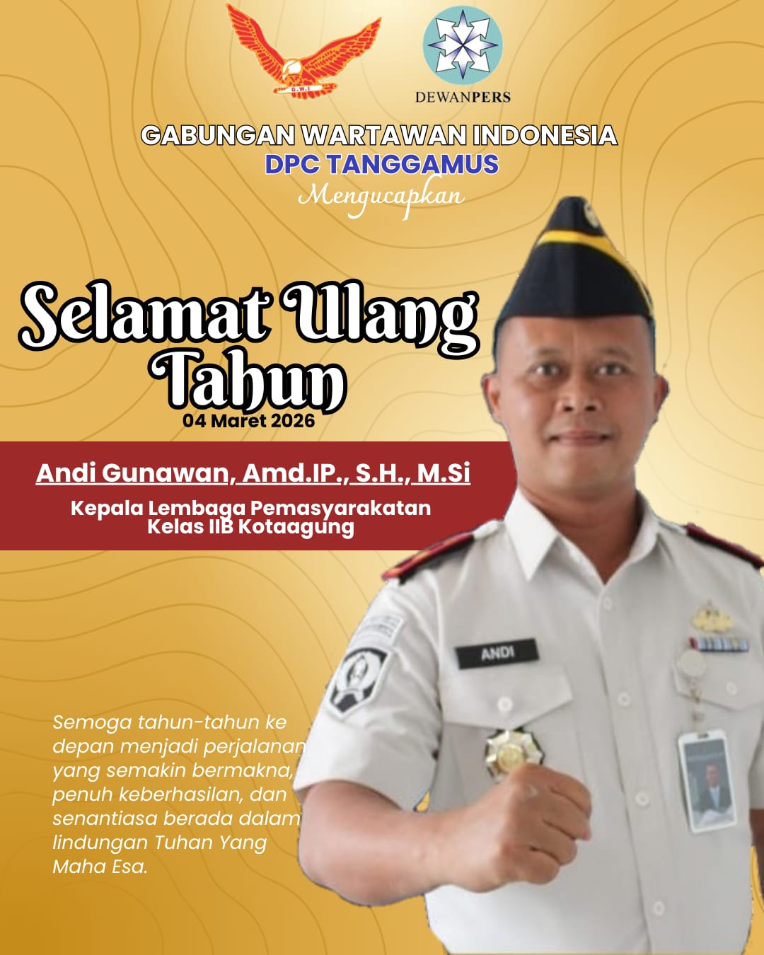 Ketua Gabungan Wartawan Indonesia (GWI) DPC Tanggamus, M. Darwin CF.LE, menyampaikan ucapan selamat ulang tahun sekaligus harapan besar terhadap konsistensi kepemimpinan di tubuh Lapas Kotaagung.